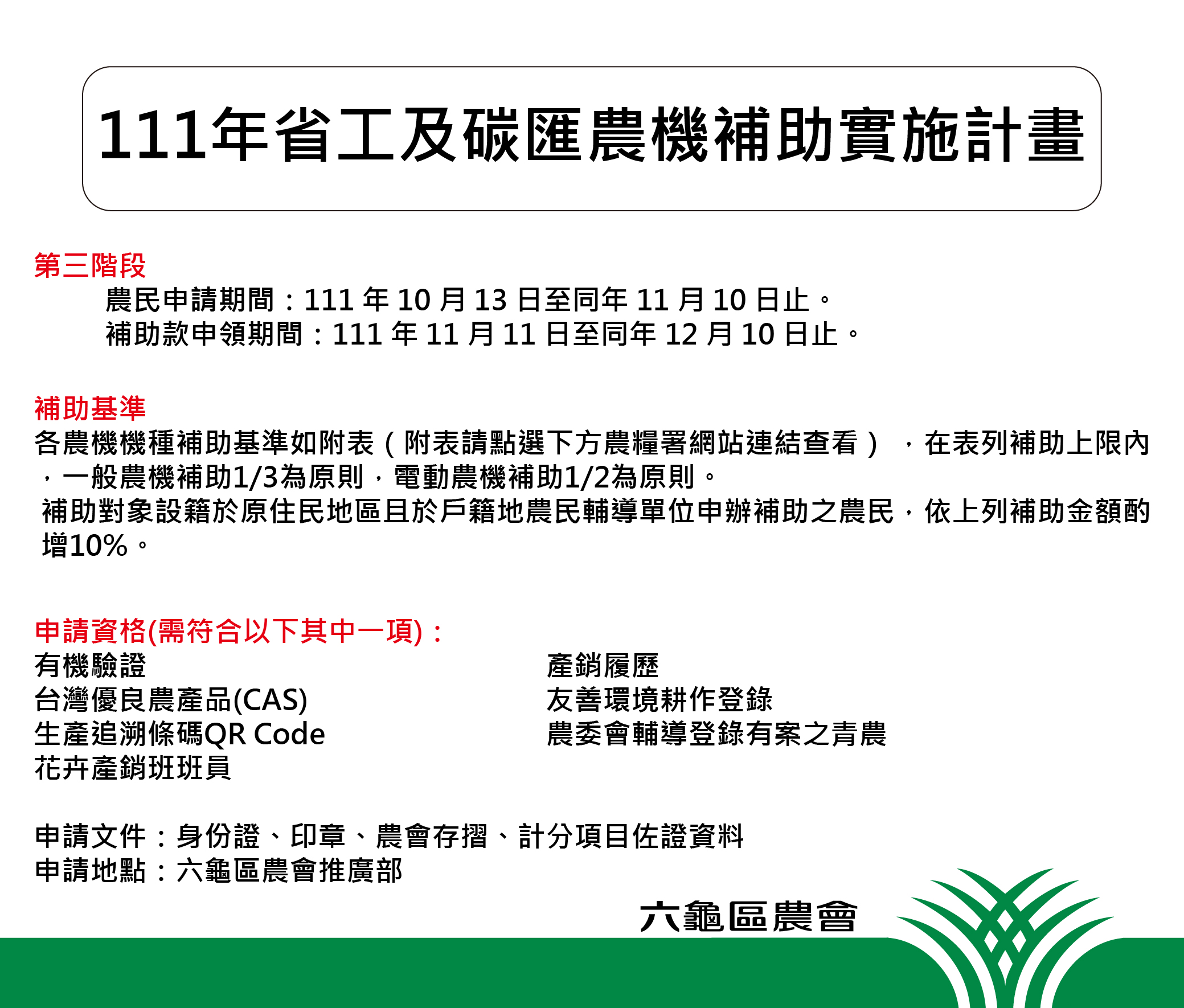 各農機機種補助基準如附表 ,在表列補助上限內,一般農機補助1/3為原則,電動農機補助1/2為原則。補助對象設籍於原住民地區且於戶籍地農民輔導單位申辦補助之農民,依上列補助金額酌增10%。