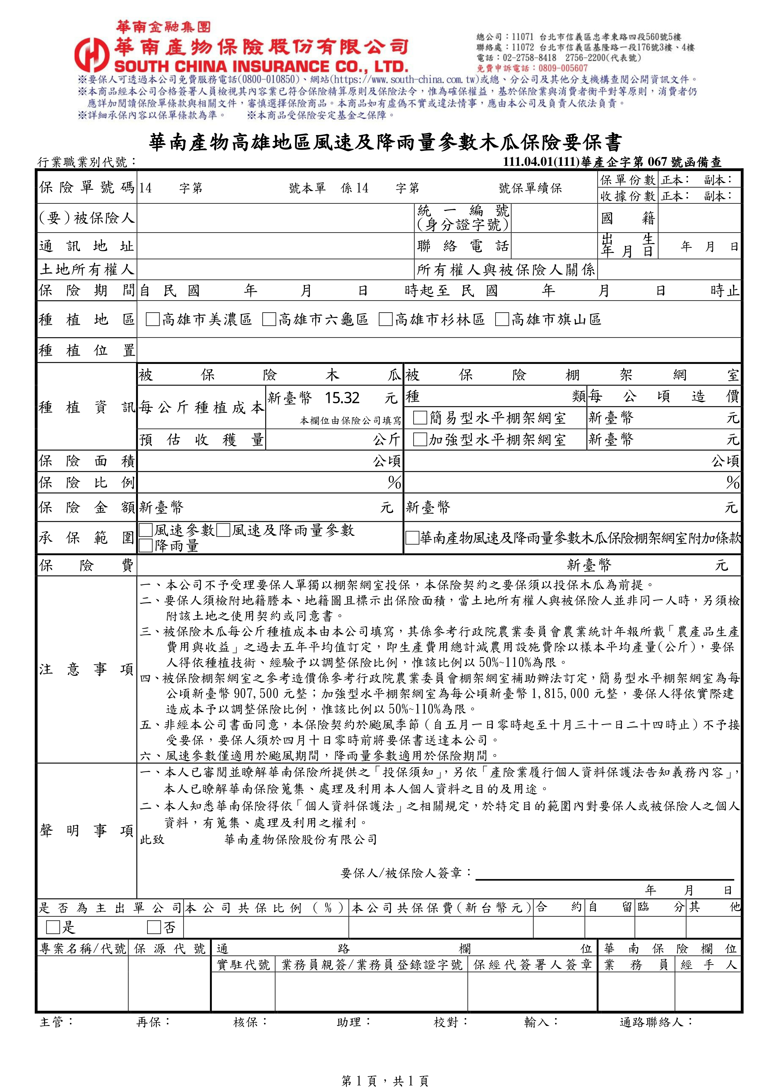 華南產物高雄地區風速及降雨量參數木瓜保險-要保書