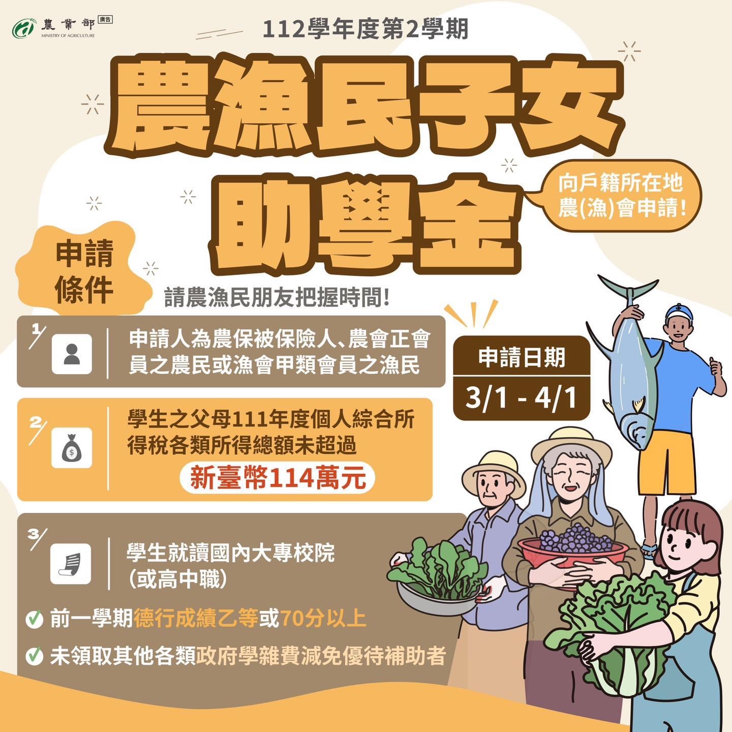 112學年度第2學期農漁民子女助學金(放寬規定)延長申請日期