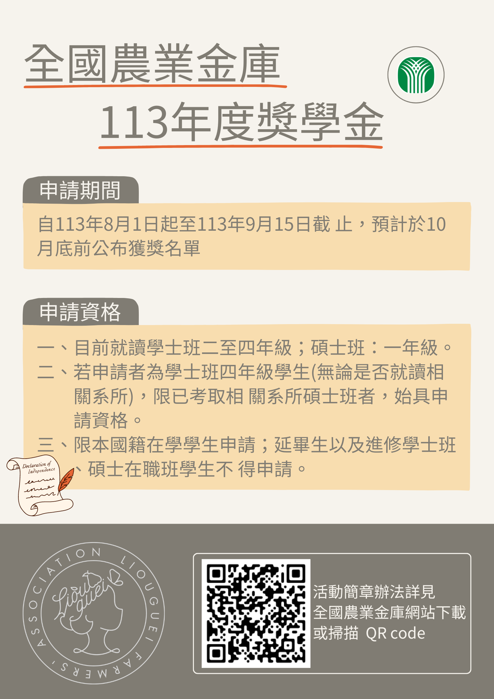 (一)作業期間:本獎學金申請期間自113年8月1日起延長至113年9月30日截止,預計於10月底前公布獲獎名單。