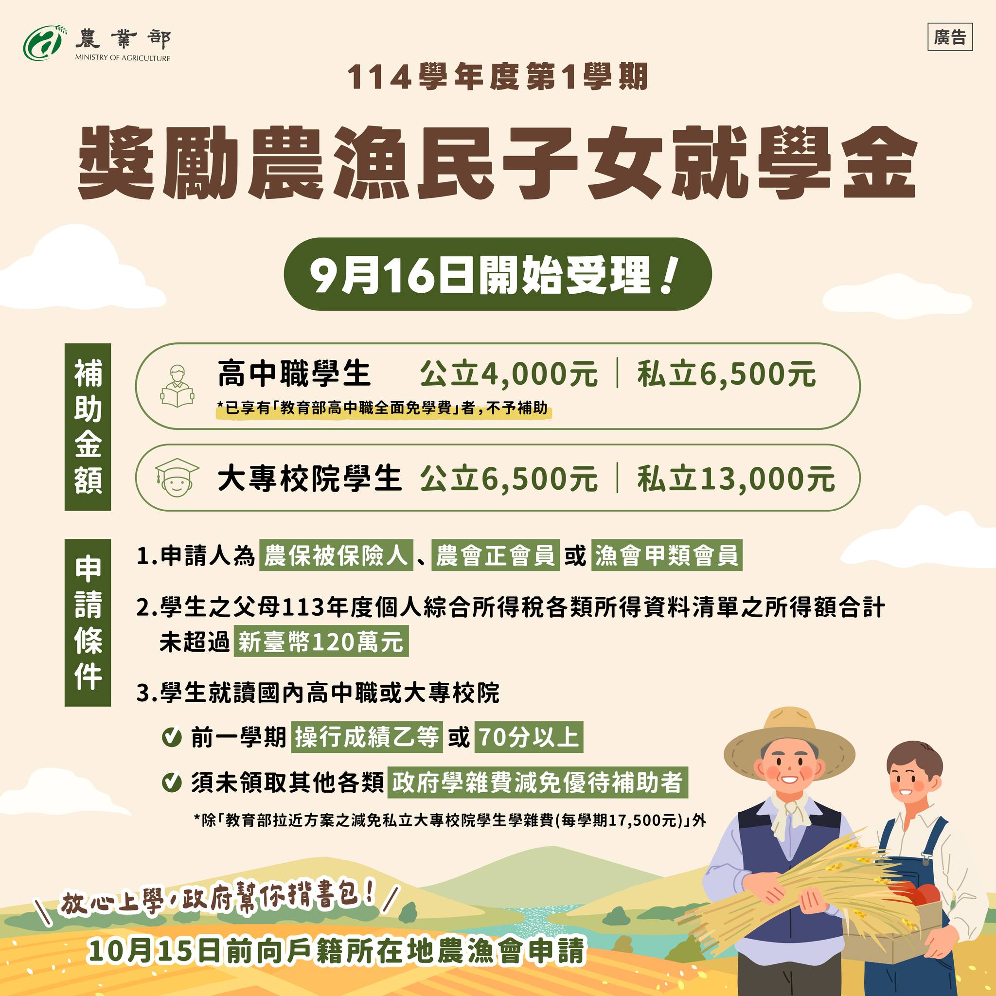 (例如) :教育部實施十二年國民基本教育,高中職若選擇教育部之免繳學費補助,則不得領取農漁民子女助學金喔!